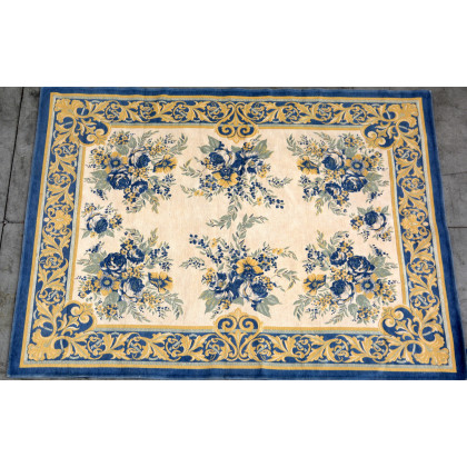 Tappeto meccanico con decoro floreale nei toni dell'azzurro, giallo e bianco (cm 178x134)(difetti)