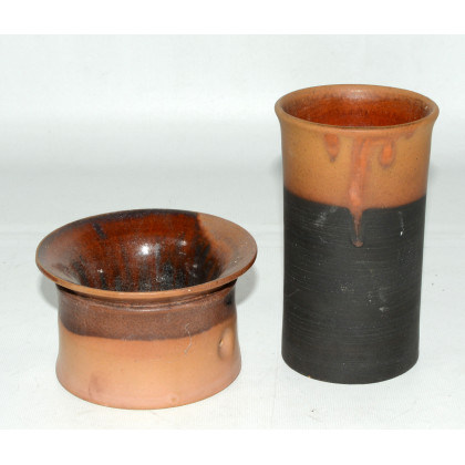 Lotto composto da una tazza e un bicchiere in ceramica smaltata nei toni del marrone e nero. Firmati alla base. Anni 60/70 (h cm 6 e 13) (lievi difetti)
