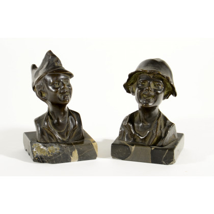 Sculture del secolo XX, "Scugnizzi", coppia di mezzi busti in bronzo, (cm 10) poggianti su basi in marmo. (difetti ai marmi)