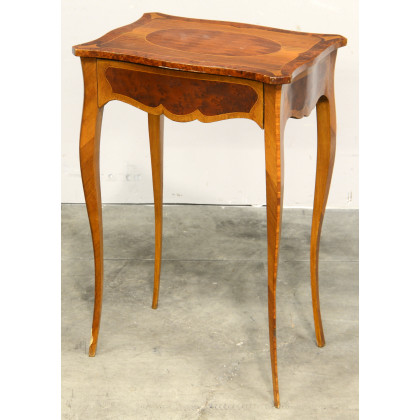 Tavolino rettangolare lastronato in radica con piano filettato ad un cassetto nella fascia. Gambe mosse, sec. XIX (cm 42x64x32)