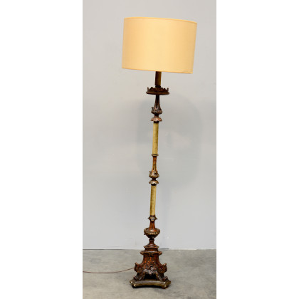 Lampada a stelo in legno intagliato decorata a motivi vegetali