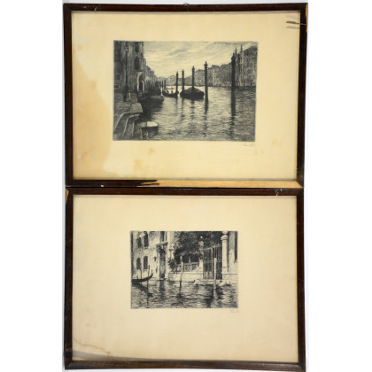 "Scorci di Venezia", lotto di due acqueforti (fogli cm 35x46), in cornici (difetti)