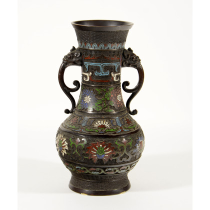 Vaso biansato in cloisonnè con decorazione floreale e anse a forma di elefante Cina, sec. XX (h. 37 cm.)