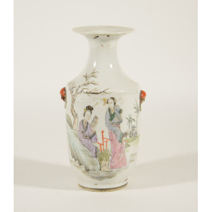 Vaso in porcellana biansato con decorazione di figure in paesaggio ed iscrizione calligrafica (difetti) (h. 23 cm.)