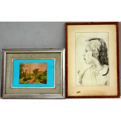 Lotto composto da un olio su carta raffigurante un paesaggio e un ritratto di bambina, autori e misure differenti, in cornici (difetti)