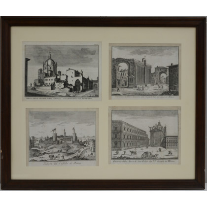 Gruppo di quattro acqueforti del sec. XVIII raffiguranti scorci di Milano. In un'unica cornice (difetti)