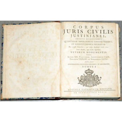 Corpus Juris Civilis Justinianei. Torino: Tipografia Regia, 1757. Due voll. in 4°, rilegati in mezza pergamena e piatti marmorizzati, taglio verde (lievi difetti)