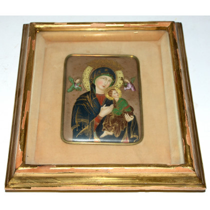 Placca in porcellana decorata in policromia raffigurante Madonna con Bambino e angeli (cm 11x8)