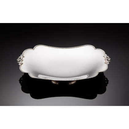 Alzata in argento di forma rettangolare sagomata con bordura cordonata e due prese a fermaglio fitomorfo. Milano, anni '60. Fratelli Alignani (gr 670 ca.)