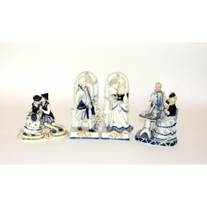 Lotto di quattro sculture in porcellana raffiguranti scene galanti, dame e cavalieri (h max cm 24) (lievi difetti)