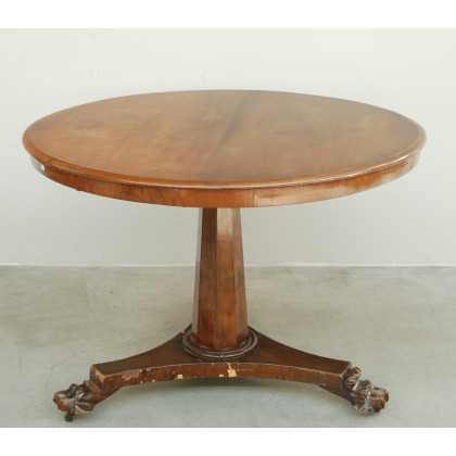 Tavolo di forma circolare poggiante su gamba centrale squadadrata con piedi ferini intagliati.(d cm 105x74)(difetti e mancanze)