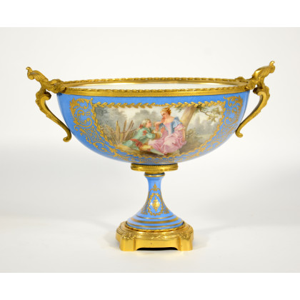 Manifattura francese. Ciotola biansata in porcellana a fondo azzurro decorata a riserve policrome raffiguranti scene galanti e paesaggi. Ghiere in metallo dorato (cm 24x32)