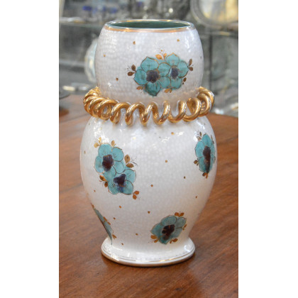 Manifattura Maiolica Derutese Volpi - Vaso in ceramica con collo decorato da un collarino dorato a torciglione, corpo a smalto bianco puntinato con fiori verdi e rilievi in oro, firmato Volpi Deruta sotto la base, anni '40/'50 del sec. XX (h cm 31) (lievi difetti)