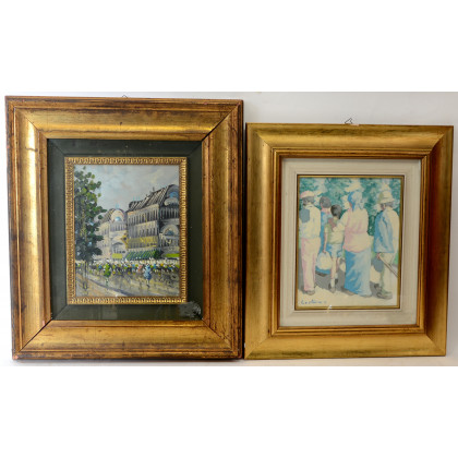 Lotto di due dipinti ad olio di autori differenti raffiguranti figure e uno scorcio di Parigi, misure differenti, in cornici (lievi difetti)