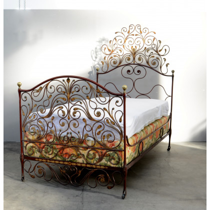 Letto a una piazza e mezzo in ferro battuto laccato rosso con cimasa e fregi dorati a fiori, foglie e volute. Pomoli torniti in ottone. Liguria, sec. XIX. Completo di cassone e materasso.
