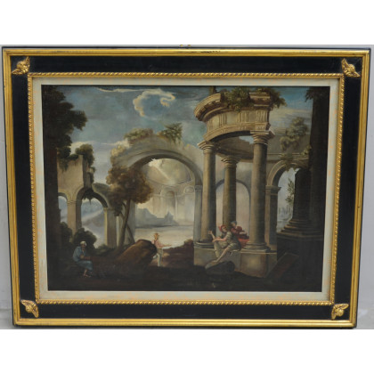 * Ignoto "Paesaggio con architetture e figure" olio su tela (cm 70x87) in cornici (difetti e restauri)