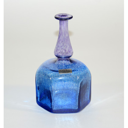 Manifattura di Kosta Boda, vaso bottiglia in vetro a macchie blu e ametista. Firma incisa alla base. Sec XX (h cm 14)