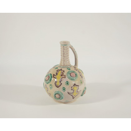 Fiasca panciuta con manico, in ceramica dipinta in policromia e realizzata su modello di Renato Rossi. Vietri sul Mare. Firma "V. Pinto Vietri S/M - Modello di R. Rossi" sotto la base (h cm 27, d cm 18) (lievi difetti)