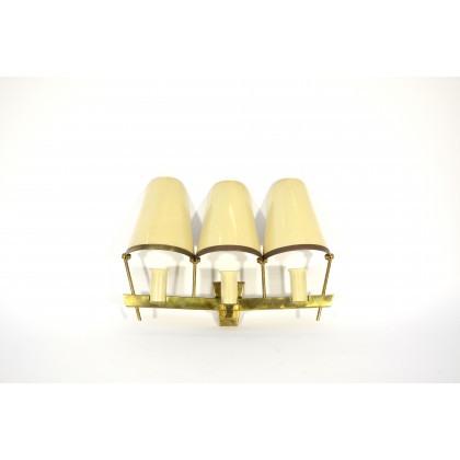 Lampada da parete a tre luci con paralumi a mezzi coni. Ottone e lamiera smaltata. Italia, sec XX (l cm 40 h cm 27) (difetti)