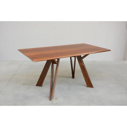 Tavolo in legno massello e impiallacciato con piano rettangolare e struttura a quattro gambe divaricate con puntali in ottone. Italia, anni 80-90 (cm 150x74x80) (difetti)