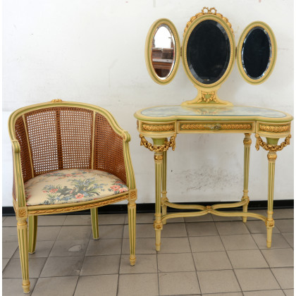 Toilette con poltrona in legno intagliato, laccato e dorato con motivi concatenati, specchio tripartito, gambe unite da traverse