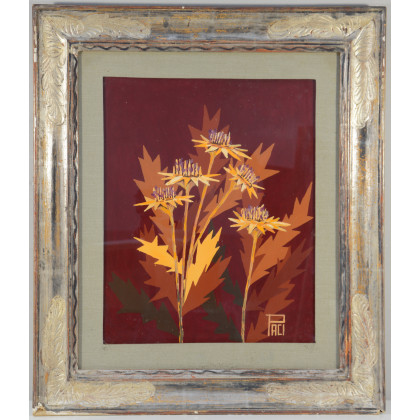 "Stelle alpine" olio su compensato (cm 50x40) firmato in basso a destra e timbro al retro. In cornice