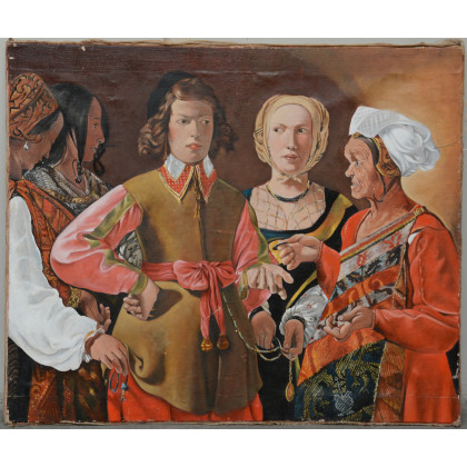 Ignoto, "Scena d'interno con figure", olio su tela (cm 100x120) (difetti)