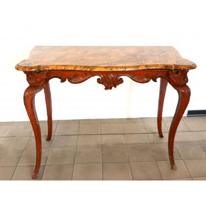 Antica consolle in legno laccato rosso con piano decorato a finto marmo. Gambe e fasce mosse (cm 105x67x60) (difetti)