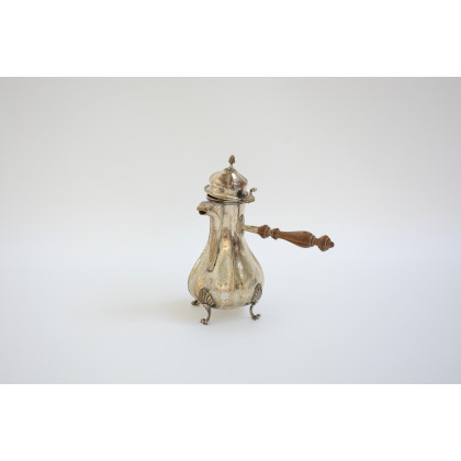 Cioccolatiera in argento in stile veneziano Luigi XV. Manico radiale in legno. Italia, sec. XX (h. cm 22,5) (gr. 430 lordi) (difetti)