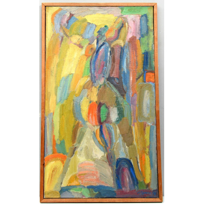 "Composizione", olio su tela (cm 70x40) firmato e datato 1956 in basso a destra, timbro di galleria al verso, in cornice