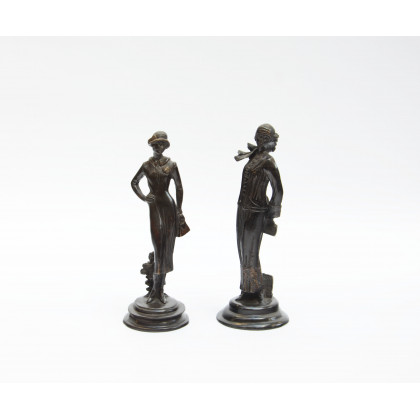 Lotto di due multipli in bronzo raffiguranti figure femminili alla moda, marcati a punta A. Moreau (h max cm 30) (difetti)