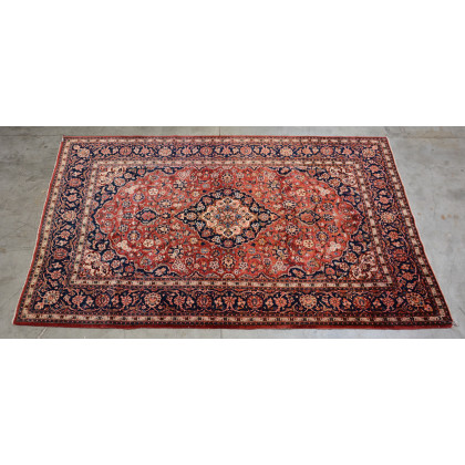 Tappeto Keshan. Persia sec. XX. Disegno a medaglioni bianco e blu su fondo rosso (cm 214x290) (difetti e mancanze)