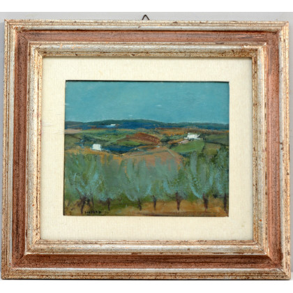 "Paesaggio" 1970, olio su tela (cm 24,5x30), firmato e datato in basso a sinistra. Firmato al retro. In cornice (lievi difetti)