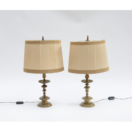Coppia di lampade a due luci in bronzo tornito con paralumi plissettati (h cm 50) (difetti)