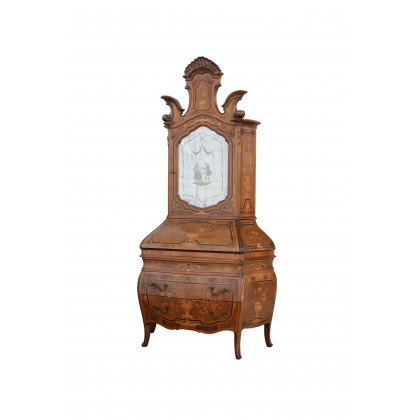 Trumeau di forma mossa lastronato in noce e intarsiato con vasi fioriti, foglie e volute. Parte superiore con anta a specchio incisa con scena galante, parte inferiore a tre cassetti e antina ribaltabile celante cassettini e vano. Piedi sagomati (cm 125x245x82)