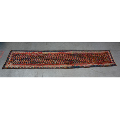 Tappeto passatoia Gandjiè, Caucaso inizio secolo XX. Disegno a file di Boteh policromi su fondo blu notte (cm 460x110) (difetti)
