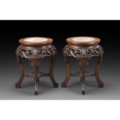 Coppia di basi portavaso in legno intagliato e traforato, decorato con uccelli e motivi floreali, piani in marmo. Cina, sec. XX (cm 32x47)