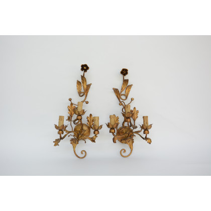 Coppia di applique a tre luci in metallo dorato decorate a fiori e foglie