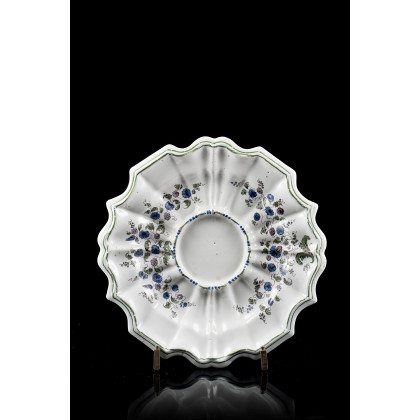 Piatto in maiolica con orlo rialzato mistilineo con forti costolature che terminano in cerchio rialzato che doveva contenere il piede della tazza da brodo. Decorazione a fiori. Bassano, manifattura P. Antonibon, sec. XVIII (d. cm 23,5) (lievi sbeccature)