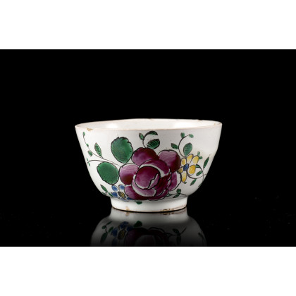 Tazzina da caffè in maiolica con decoro policromo ‘alla rosa’. Mancante del piattino. Firmata sotto il piede Jacques Boselli in bruno. Savona, manifattura Boselli, fine sec. XVIII (d. cm 8,5) (restauri)