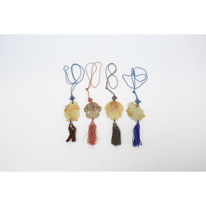 Quattro placche in giada color celadon intagliate con ceste e creatura fantastica Cina, sec. XX (l. max. 6,5 cm.)