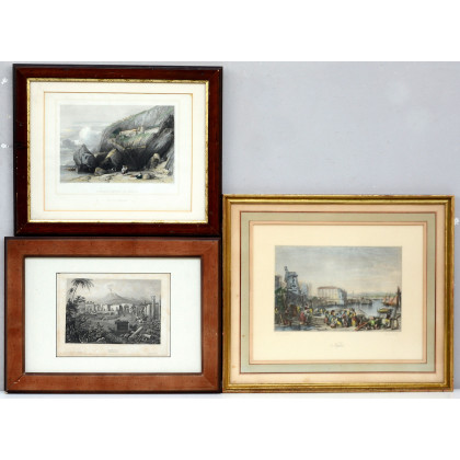 Lotto di tre incisioni raffiguranti scorci di Napoli, Pompei ed Amalfi, misure differenti, in cornici (difetti)