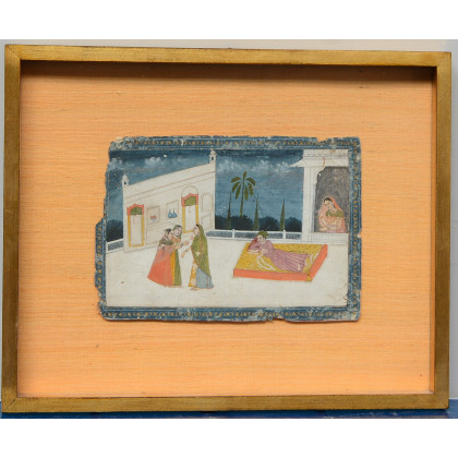 Dipinto raffogurante cortigiane in scena di palazzo, colore su carta (cm 20x27)area indiana, fine secolo XIX-inizio XX, in cornice (difetti)