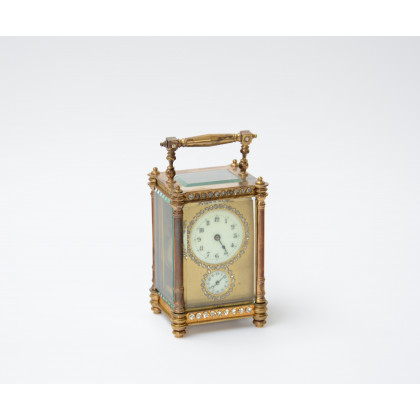 Officier in metallo dorato e cesellato a fiori, due quadranti smaltati decorati con strass (h cm 13)(difetti e mancanze)