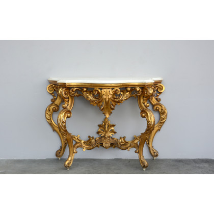 Consolle di forma sagomata in legno dorato. Riccamente intagliata e traforata a motivi vegetali a volute. Gambe sagomate riunite da traverse, terminanti con foglie e frutti. Piano in marmo, sec. XIX (cm 192x104x62)