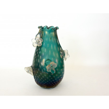 Manifattura di Murano. Vaso in vetro nei toni del blu e del verde iridato sulla superficie esterna con inclusioni di bolle, decorato in rilievo a fiori (h cm 35) (difetti e mancanze)