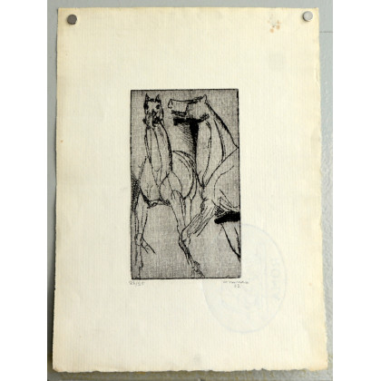"Cavalli" 1962, acquaforte (lastra cm 17,5x10 foglio cm 33,2x24,2) numerata 22/25, firmata e datata in basso in lapis. Impressione stampata su carta filigranata (lievi difetti)