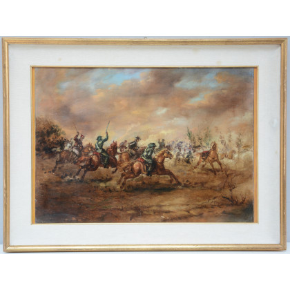 Firma indecifrata, "Battaglia risorgimentale", olio su tela (cm 50x69) firmato in basso a sinistra, in cornice