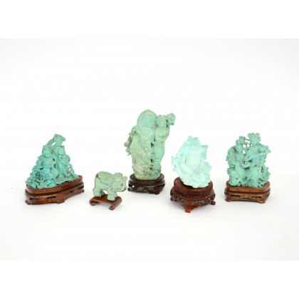 Lotto di cinque sculturine orientali in pasta di turchese (misure diverse) (difetti)