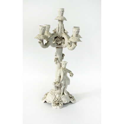 Manifattura della prima meta del sec. XX. Grande candeliere a cinque fiamme in porcellana bianca con fusto decorato con nobiluomo (h cm 53) (difetti)